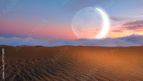 Beautiful sand dunes in orange desert at sunrise with crescent moon - Sahara, Morocco