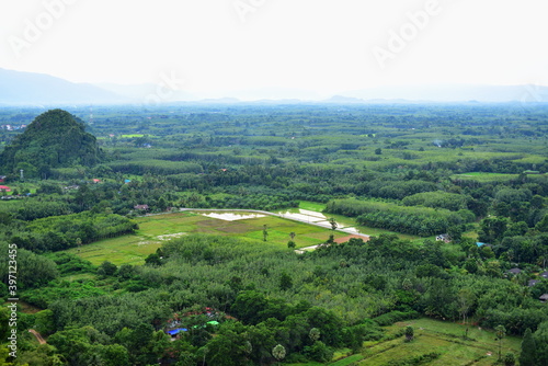 Beautiful scenery and sky with green trees, white and gold clouds. And the mountains before sunset the sunset from the top of the mountain