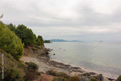 Beautiful scenery by the sea in Metamorfosi village, Chalkidiki, Greece, on a cloudy day