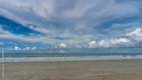 Beautiful sea and sky scenery. Turquoise ocean waves foam and spread over the sandy beach. Picturesque cumulus and cirrus clouds in the blue sky. Malaysia. Borneo. Kota Kinabalu