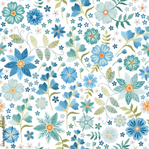 Beautiful seamless pattern with embroidery blue flowers on white background. Fashion summer design.