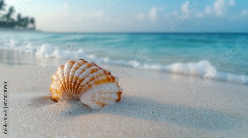 Beautiful seashell rests on a sandy beach with turquoise ocean waves gently lapping in the background at sunset