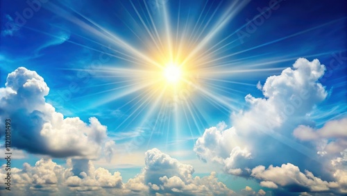Beautiful, serene summer sky with fluffy clouds and a bright sun shining in the background , blue, summer, sky, fluffy clouds