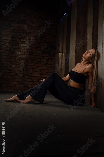 Beautiful sexy blonde woman model in black pants and black top posing on metal wall background..