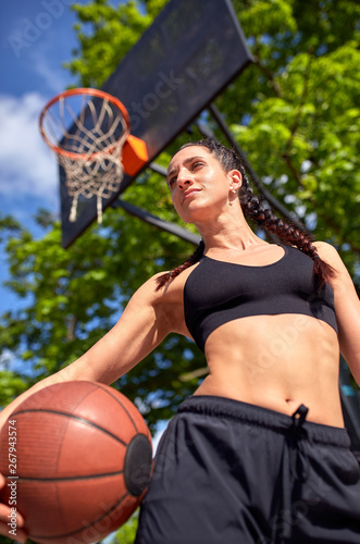 Beautiful sexy fitness girl in black sport wear with perfect body with basket ball at basketball court. Sport, fitness, lifestyle concept