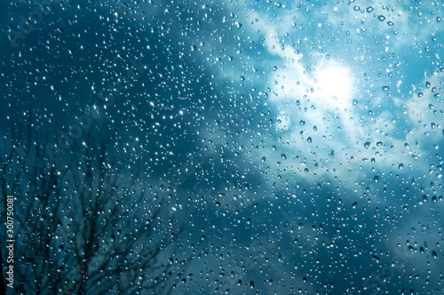 Beautiful sky and clouds, rain, wet glass, drops of water on the glass, drops of water on the window, drops