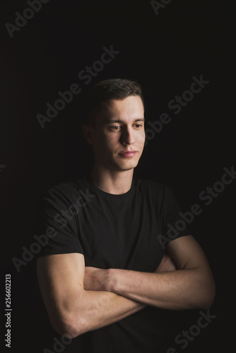Beautiful, slender young man in black t-shirt on black background and on the street
