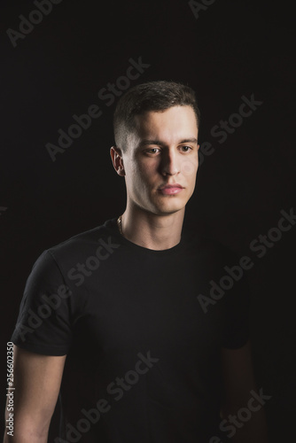 Beautiful, slender young man in black t-shirt on black background and on the street