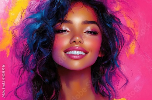 Beautiful smiling African American girl with voluminous curly hair and bright white teeth in a cheerful pop art style portrait