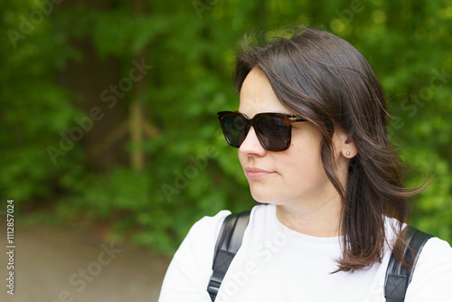 Beautiful smiling dark-haired girl in a white T-shirt and with a backpack on her shoulders in the summer on a trip. Pedestrian wanderung concept
