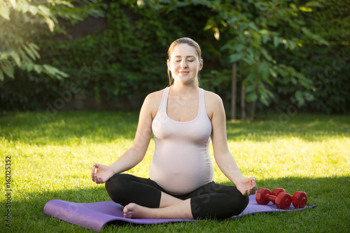 Beautiful smiling pregnant woman sitting in lotus pose on grass at park