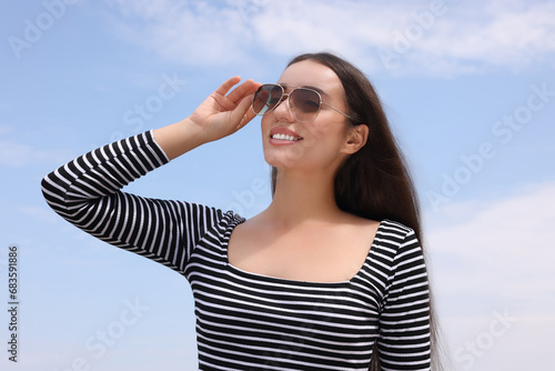 Beautiful smiling woman wearing stylish sunglasses outdoors