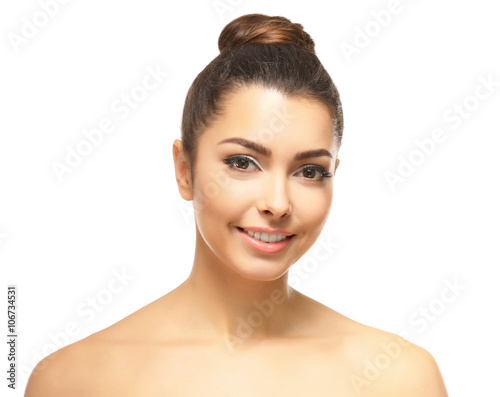 attractive, background, beautiful, beauty, brown, bun, care, caucasian, clean, cleansing, clear, closeup, concept, cute, dark, face, facial, fashion, female, fresh, girl, gorgeous, hair, health, healthy, isolated, make-up, model, natural, pale, people, honed, person, portrait, posing, pretty, pure, romantic, skin, skincare, smile, smiling, spa, style, trend, trendy, white, woman, young, youth