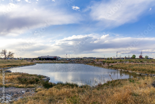 Beautiful spring landscape with a pond and reflections in the small neighborhood park in Aurora, Colorado