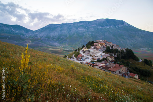 Beautiful summer landscape at Piano Grande (Great Plain) mountain plateau in the Apennine Mountains, Castelluccio di Norcia, Umbria, Italy