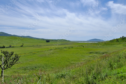 Beautiful summer landscape of hilly meadows with blue, cloudy sky