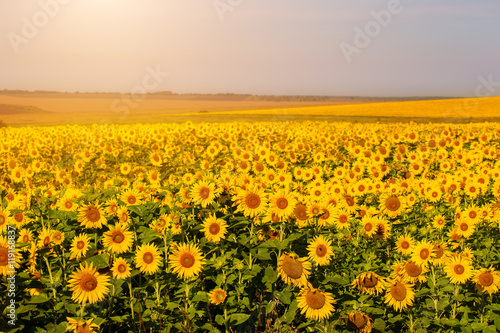 Beautiful sunflowers at sunset in the field.