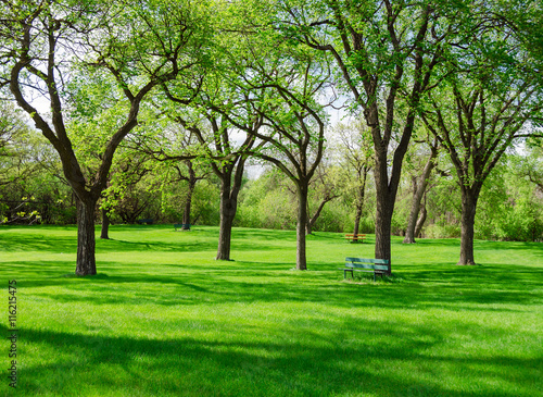 beautiful sunny day in park at spring time, blue cloudy sky, green lawn, leafy trees
