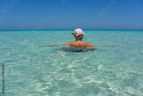 Beautiful Sunny day on the coast of Cuba, Varadero, a Cuban girl swims in the azure waters of the Atlantic ocean.