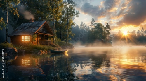 beautiful sunrise on a lake with fog surrounded by forest and a cabin