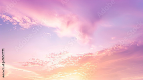 Beautiful sunrise or sunset with soft pink, purple, violet, and orange hues. The sky is filled with cirrus clouds illuminated by the sunlight, creating an abstract and serene background.