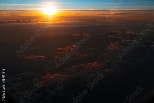 abstract, calm, shiny, heaven, sunny, cloudy, fly, weather, window, air, flight, aeroplane, up high, travel, natural, tour tourism, aerial, cloudscape, white, scene, high, scenic, dusk, sunrise, morning, bright, colourful, colours, atmosphere, cloud, water, sky, nature, landscape, beautiful, sunset, sun, summer, view, orange, evening, background, light, horizon, blue, sunlight, beauty, dawn