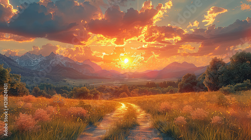 Beautiful sunset over a field with mountains in the background. The sky is filled with clouds and the sun is setting, creating a warm and peaceful atmosphere