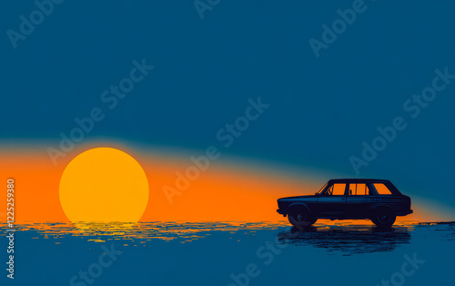 Beautiful sunset over calm waters with a car parked on the shore