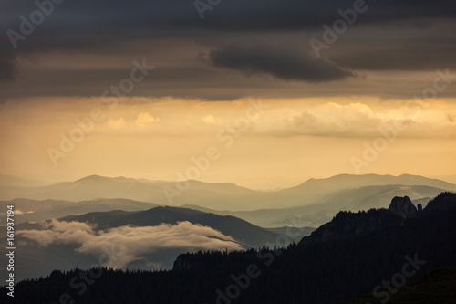 Beautiful sunset over mountains with storm clouds in background. Masivul Ceahlau, Romania.