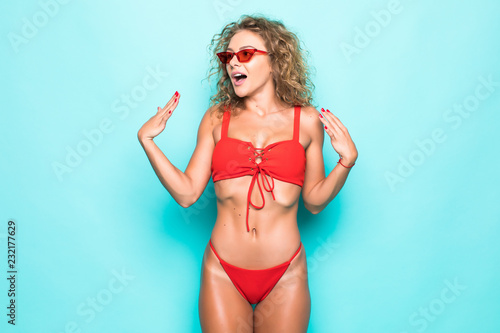 Beautiful surprised curly girl in colorful bikini and sunglasses, emotionally looking on camera over blue background