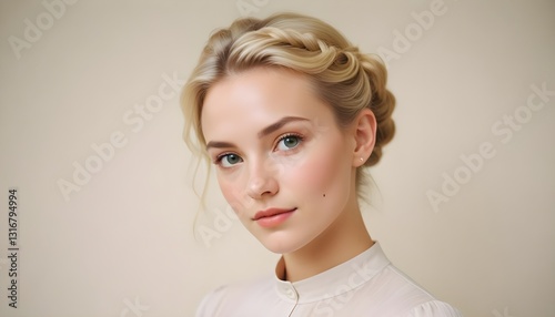 Beautiful Swedish girl with golden blonde hair and a serene expression standing against a neutral wall