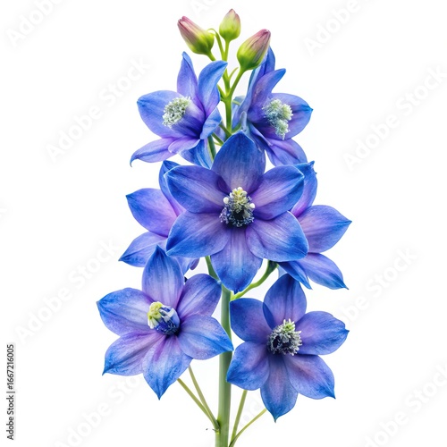 delphinium, flower, blue, purple, bloom, blossom, floral, flower petals, stem, nature, plant, botanical, gardening, horticulture, white background, closeup, macro, studio shot, single flower, elegant, vibrant, beauty, delicate, seasonal, wildflower, spring, summer, flora, flowering plant, freshness, isolated, cut-out, botany