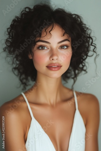 woman, model, beauty, fashion, portrait, studio, curly hair, freckle, tanned, skin, make-up, coiffure, posing, beautiful, attractive, feminine, elegant, stylish, glamour, skincare, cosmetic, healthy, natural, wellness, lifestyle, brunette, dark hair, brown eyes, white top, clothing, apparel, contemporary, trendy, young adult, female, head shot, closeup, person, lady, girl, youth