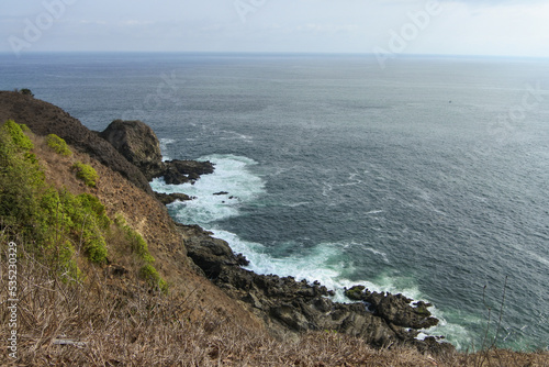 Beautiful Teluk Bay with blue ocean, clouds, and mountains in Jember, East Java, Indonesia.
