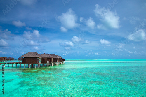 Beautiful tropical Maldives island with beach. Sea with water bungalows