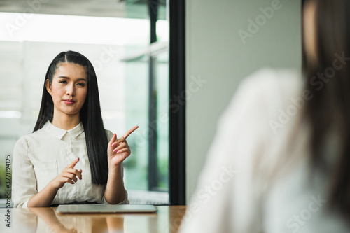 Beautiful two women Sit and work apart discussing with laptop and tablet on the table social distancing concept.