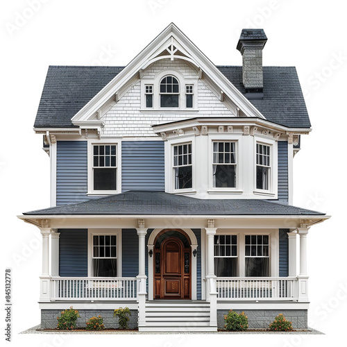 Beautiful two-story Victorian house with blue siding, white trim, a front porch, and garden. Perfect for real estate and architectural design.