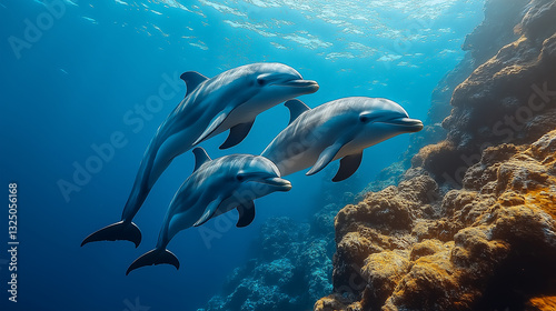 dolphin, bottlenose, oceanic, marin, mammal, animal, underwater, sea, ocean, water, blue, swimming, group, pod, three, fin, tail, body, sleek, streamlined, intelligent, social, playful, wildlife, nature, aquatic, habitat, reef, coral, sunlight, ray, depth, beautiful, amazing, marvellously, free, wild, conservation, protection, species, ecosystem, environment, close, up, portrait, graceful, movement