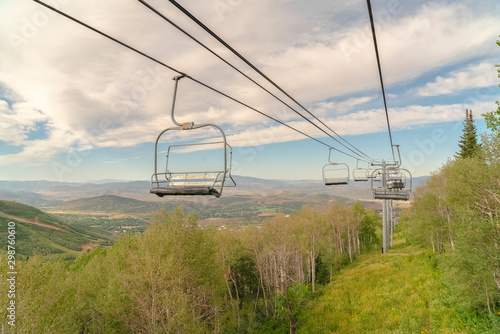 chairlift, summer, ski lift, ski, resort, tree, leaf, green, grass, mountain, view, seat, landscape, sky, blue, cloud, travel, tour tourism, recreation, recreational, nature, chair, lift, scenery, utah, scenic, sunny, day, cloudy, copy space