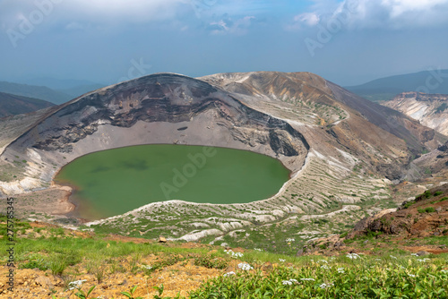 Beautiful view of Okama crater lake at Mount Zao in summer sunny day. active volcano in Miyagi Prefecture, Japan