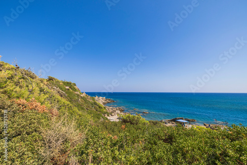 Beautiful view of rocky coast on turquoise water background in Mediterranean sea. Greece.
