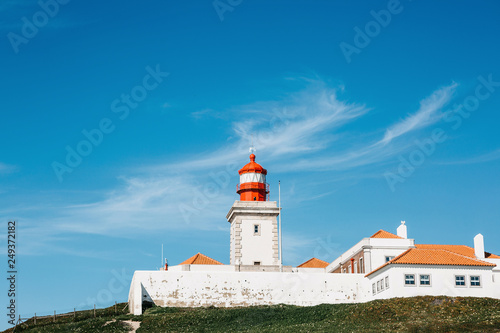 Beautiful view of the lighthouse off the west coast of the Atlantic Ocean at Cape Roca in Portugal.