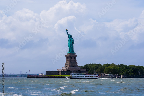 Beautiful view of the Statue of Liberty on blue sky background , the Hudson River and the skyscrapers of Manhattan, New York ,USA