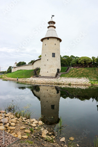 Beautiful view to tall tower of Pskov kremlin (krom) with reflection in water and rivers Pskova and velikaya