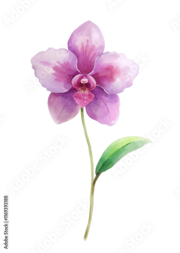 Beautiful watercolor orchid flower, vibrant purple petals, delicate green leaf, botanical illustration, nature art.