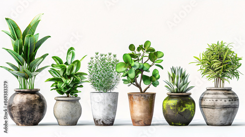 Beautiful watercolor-style houseplants in various decorative pots on white background