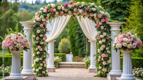 wedding, ceremony, arch, flower, decoration, flower, archway, rose, floral, love, romance, celebration, marriage, summer, garden, nature, green, white, pink, beautiful, elegant, day, sunny, luxury, event, party, design, background, bouquet