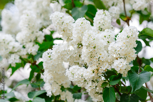 Beautiful white lilac flowers in nature. A branch of white lilac in the spring garden