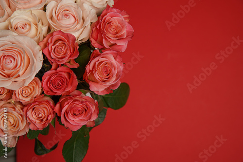 Beautiful white, red, tabby tea rose flowers in a vase, photographed from above on the red table. Spring flowers. Wedding mothers day and valentines day background. Selective small depth of field.