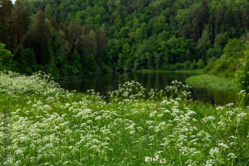Beautiful wild and natural blooming meadow in Sigulda Gauja National Park in Latvia in June at the river Gauja